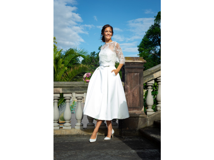 Diese klassische Brautkleid in einem eleganten Cremeton und der aktuellen Midilänge wirkt elegant und dennoch lässig. Die eingearbeiteten Eingriffstaschen verleihen dem Kleid eine junge und unkonventionelle Aussage. Das Corsagenoberteil ist mit einer zarten Spitze besetzt und bringt Stil und Eleganz in dieses Modell. Hier gibt es eine Komplettierung mit einer passenden kurzen Spitzenjacke mit 3/4 Ärmeln. Das Besondere: der Verschluss der Jacke ist nach hinten verlegt. Durch ein zartes Seidenband wird das Jäckchen hinten mit einer Schleife gebunden, so kann die Spitze locker fallen und jeder Windhauch bringt Bewegung in das Outfit.