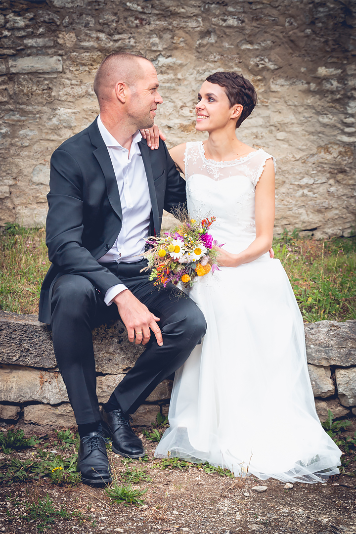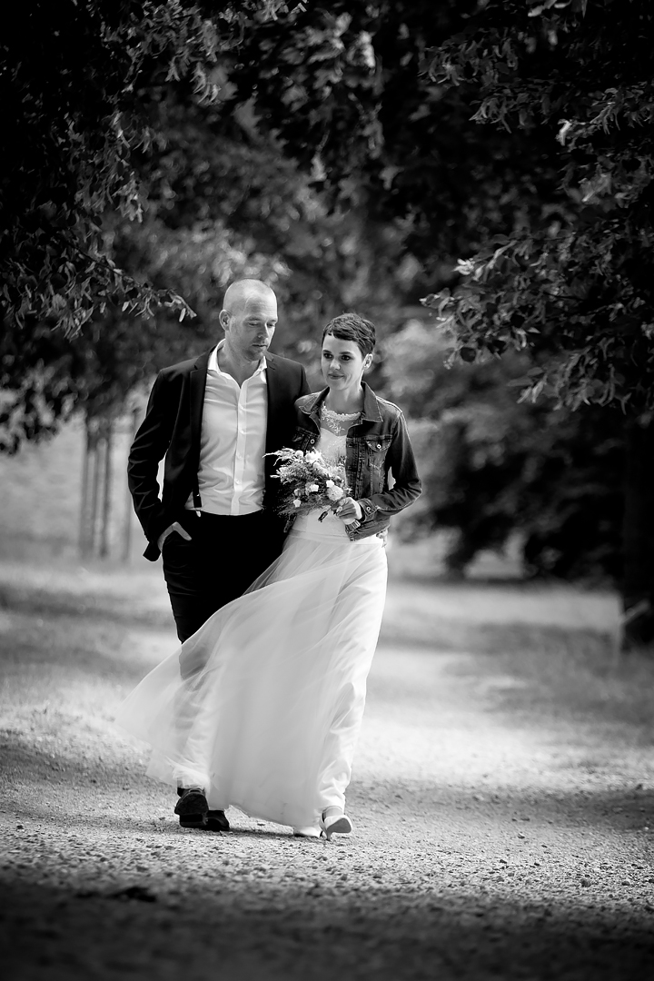 Wie herrlich unkompliziert Elke als Braut ist, zeigte sich auch daran, dass sie ihr ganz persönliches Brautkleid pfiffig mit einer bequemen Jeansjacke kombinierte. So trotzte sie den überraschend kühlen Temperaturen am Hochzeitswochenende und präsentierte sich dabei ganz trendbewusst: Zusammen mit der Jeansjacke verströmte die zarte Tüllspitze des Kleides einen romantischen Vintage-Zauber, ohne dabei die lässig-modernen Noten zu vermissen. Genauso charmant und natürlich haben wir Elke kennengelernt – umso schöner, dass unser maßgeschneidertes Brautkleid diesen sympathischen Wesenszug unterstützen konnte. Wir freuen uns, dass wir als Designerinnen zu Elkes Traumhochzeit einen Teil beitragen konnten. Alles Gute für Euch, Elke und Andi!
